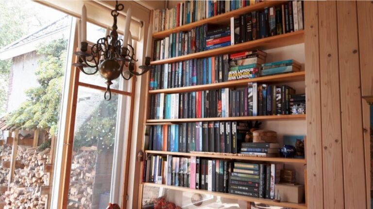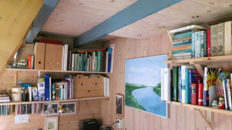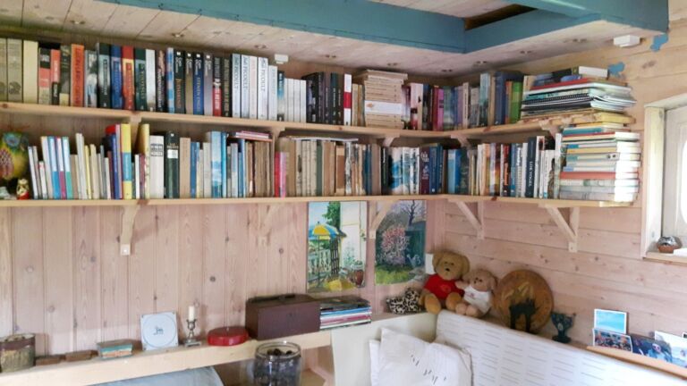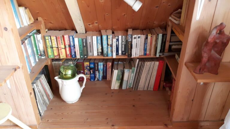 Nadat ook de gang, de slaapkamer en de overloop vol met boeken stonden kwamen er planken in het tuinhuis en maakte ik met de timmerman de afspraak dat wat ik hem ook nog zou vragen, hij géén nieuwe boekenplanken meer mocht maken…