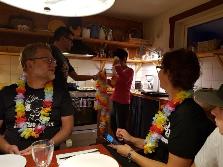We waren uiteindelijk met z’n tienen en we kregen allemaal een traditionele Hawaiiaanse bloemenslinger die volstrekt niet af mocht, ook niet tijdens het eten.