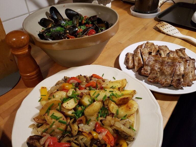 Het was ongelooflijk wat ze allemaal had gemaakt. Er was een heerlijke paddenstoelensoep, er waren salades, verschillende soorten vis, mosselen, vlees, aardappeltjes, asperges, fruit en macadamianoten vers uit Hawaï. Er was wijn en er waren chocolade en koekjes voor bij de meegebrachte speciale kruidenthee die ze zelf samenstelt. Ik denk dat ze voor een vermogen aan boodschappen hebben gedaan.