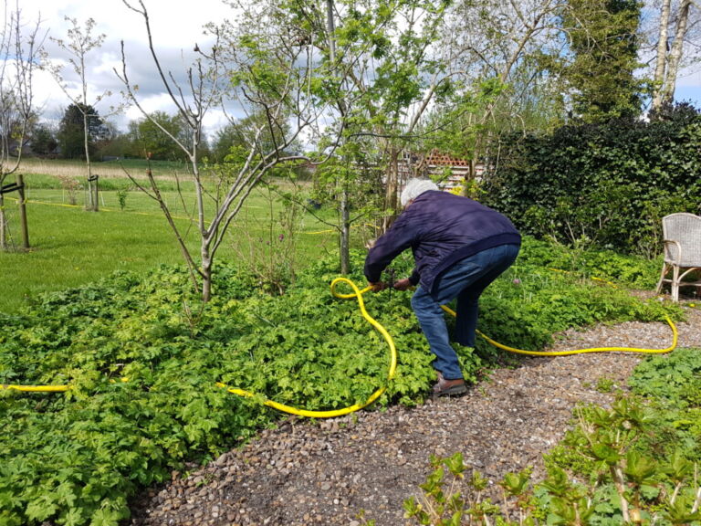 Er kwam een groter terrasje, nieuwe rieten tuinstoelen van Marktplaats die ook nog werden thuisgebracht door lieve vrienden. De pomp en de sproeiers werden door Ch. geïnstalleerd, de tuinmannen maaiden en hielpen me waar nodig dus Het Landgoed groeit en bloeit!