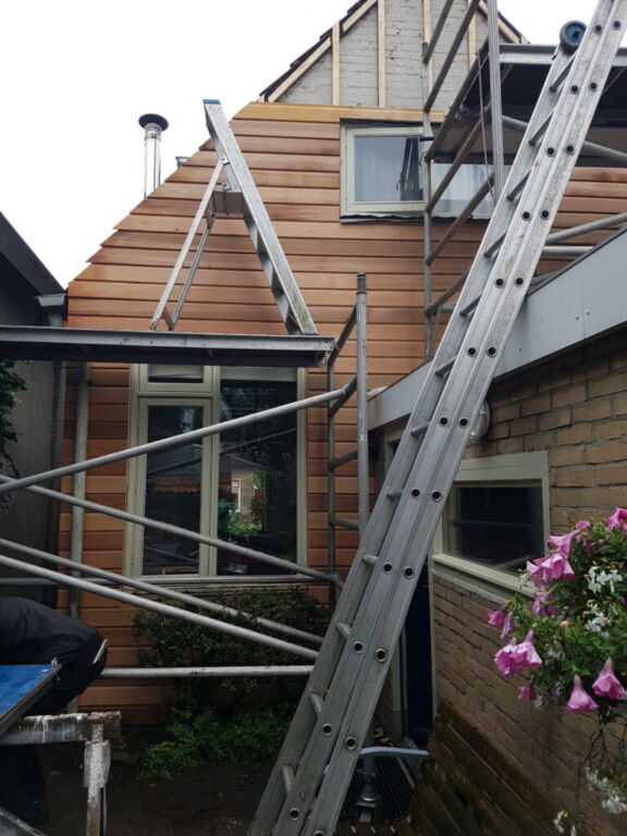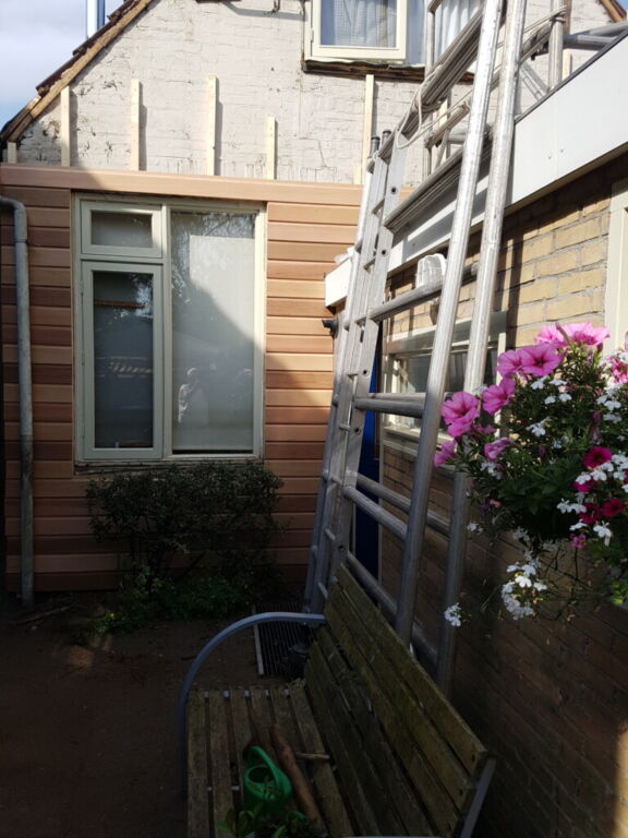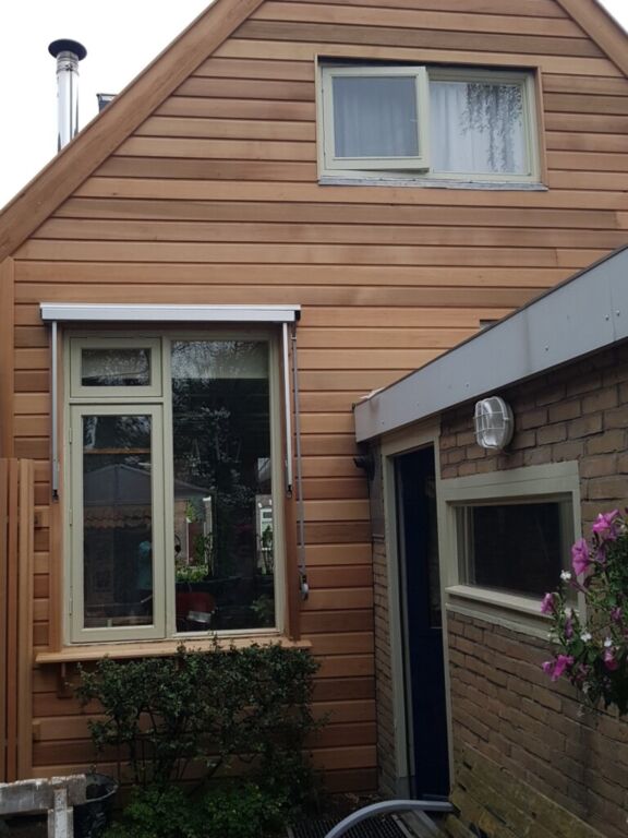 De buitenkant van mijn kabouterhuisje werd geschilderd, het laatste enkel glas ruitje werd door thermopane vervangen en de achtergevel kreeg een nieuwe jas van vrijwel onbetaalbaar red cedar!