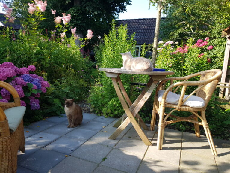 Zo zaten we op een mooie zondag allebei achter ons huis van de zon te genieten.