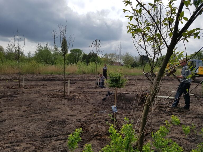 Door de onverwachte warmte was het razend druk bij mijn tuinman maar gelukkig maakte hij met zijn mannen overuren om de boompjes te komen planten!