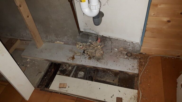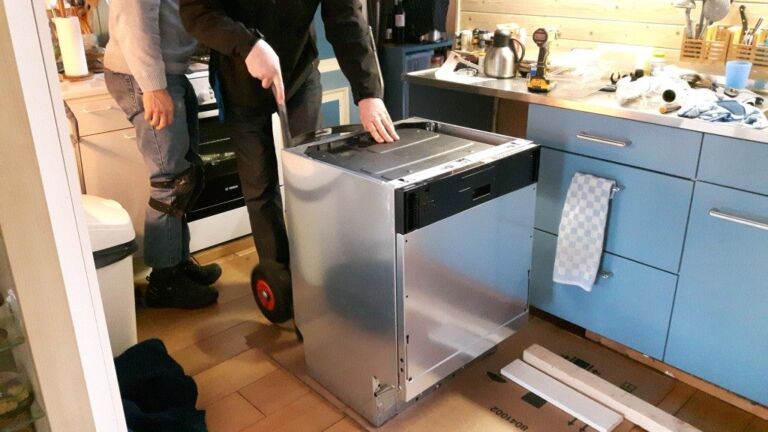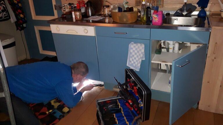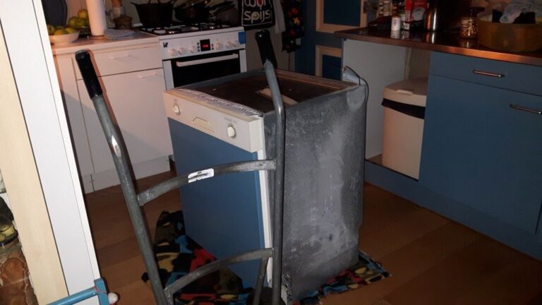 Als eerste zou de oude afwasmachine eruit worden gehaald. Dat gaf ruimte en we konden zien hoe het met de vloer en de leidingen was. Een hele klus, monteur Piet was bijna twee uur bezig het zeer degelijke en dus loodzware apparaat eruit te krijgen!