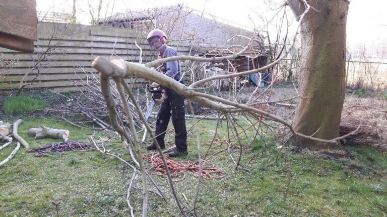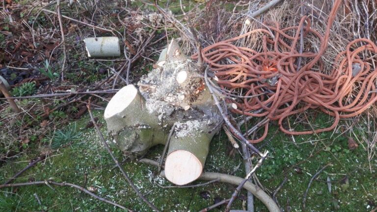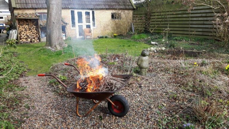 Een houthok vol nieuwe houtjes en een kar vol kastanje- en hortensiatakken die ik zelf al had gesnoeid, de bladblazer door de tuin zodat alles weer schoon was en toen zelf maar even doorgepakt en alle dooie troep van de vaste planten gehaald en opgestookt. Laat de zomer maar komen!