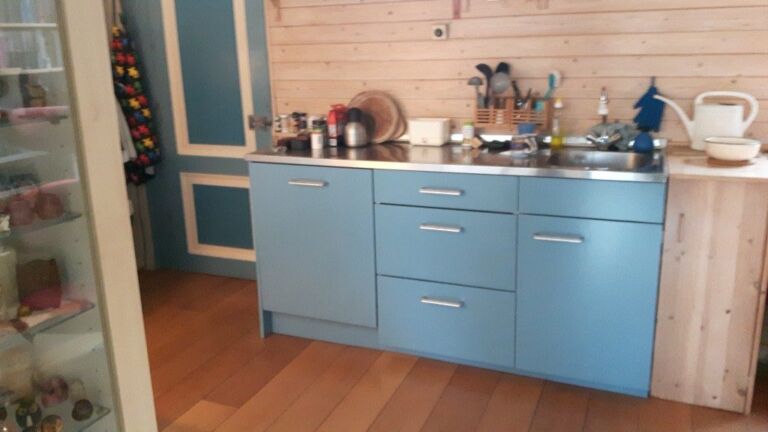 Na twee dagen hard werken zat het nieuwe keukenblok er in, inclusief het kastje met vijf plankjes die aan de zijkant van het keukenkastje vastzaten en die er dus allemaal uit en er weer in moesten. Toen eindelijk alle frontjes opgehaald bij de schilder. Het kon net – ze waren droog maar moesten met zachtheid behandeld worden! En wat heerlijk om in plaats van een kastje nu uittrekladen te hebben waardoor ik niet meer op mijn kop hoef te staan om ergens bij te kunnen.