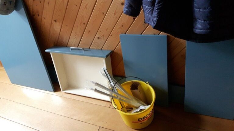 Op dag vier kwam de nieuwe afwasmachine en dat werd toch weer een hele operatie. De aan- en afvoerslangen moesten verlengd en achter het nieuwe kastje door worden gefrommeld maar ook dat lukte dankzij de mannen. Helaas, toen bleek er toch iets niet te kloppen. Het front van de afwasmachine was gebruikt als zijpaneel! Op zich niet erg want het oorspronkelijke zijpaneel kon op maat worden gemaakt maar daardoor moesten er weer kopse kantjes geschilderd worden…