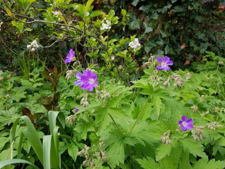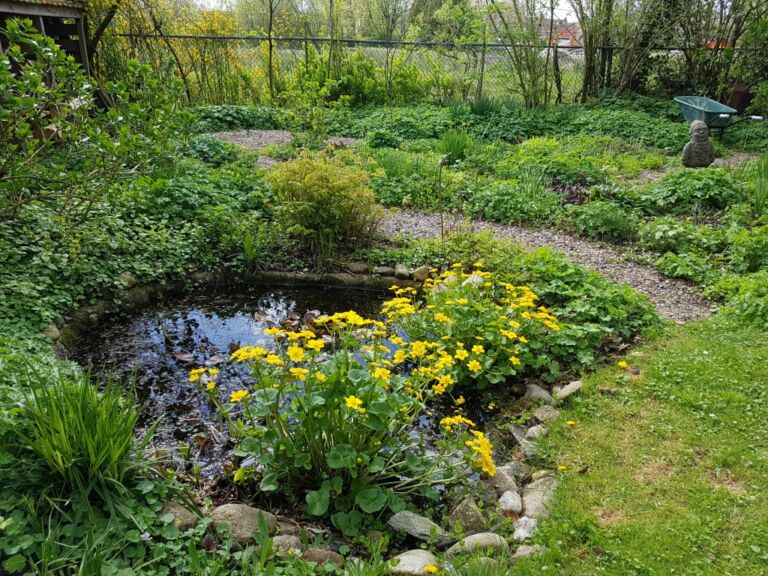 De dotters in de vijver waar de salamanders en de kikkers tussen door zwemmen, de wilde orchideeën, de acanthussen, floxen, wederik, Pinksterbloemen, madeliefjes en heel veel ooievaarsbekken. De Zweedse ooievaarsbek bloeit zelfs al met op de achtergrond bloesem van de appelstruik en mijn kabouter lacht en ziet dat het goed is.