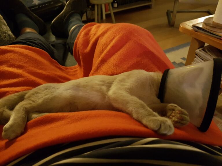 Het werd een logeerpartij van vijf dagen bij de dierenarts waar ongelooflijk goed voor hem werd gezorgd. Iedereen was gek op hem, bij iedere pauze werd hij uit zijn hokje gehaald om rond te rennen, de artsen namen hem mee naar hun kamer als ze administratie moesten doen dus daar lag het niet aan. Maar de hele dag met een kapje op in een kleine bench, ik vond het vreselijk! Gelukkig mocht voor het weekend de drain eruit en kon ik hem vrijdagmiddag ophalen!