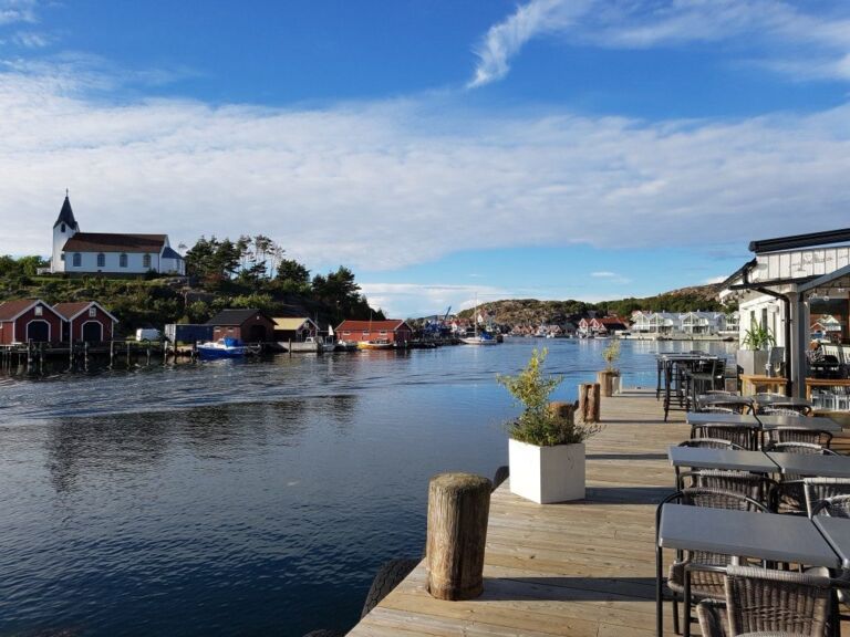 Na Tanumshede namen we de kustweg met de bekende havenplaatsjes zoals Grebbestad, Fjällbacka (waar de boeken van Camilla Läckberg zich afspelen en waar Ingrid Bergman is geboren) en Hamburgersund waar we heerlijk in de zon buiten op een terras hebben zitten eten.