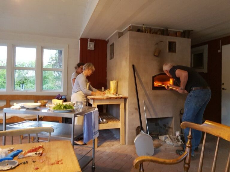 De oven had al de hele dag gebrand om op temperatuur te komen. Het vuur werd op het laatste moment opzij geschoven zodat de pizza’s in het midden op de hete plaat konden liggen en binnen een paar minuten klaar waren, met dank aan Gerda en Mats!