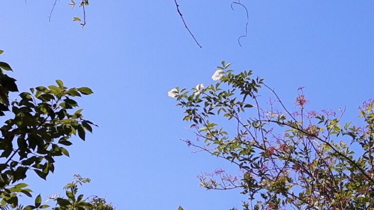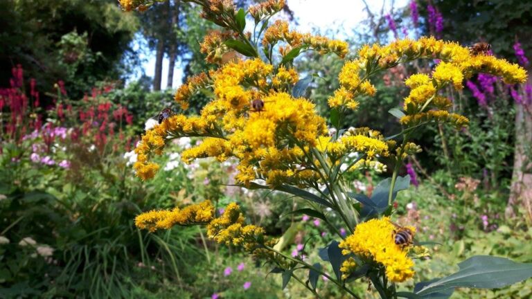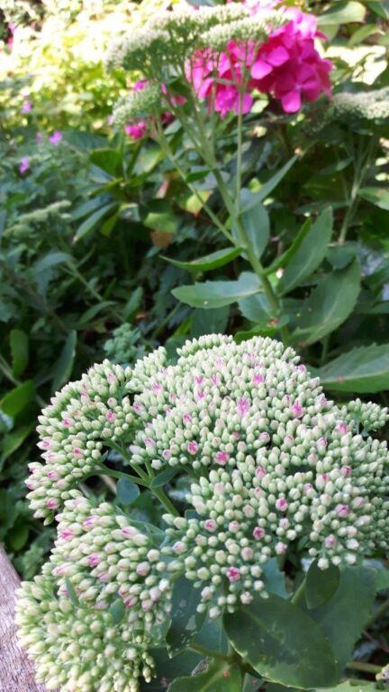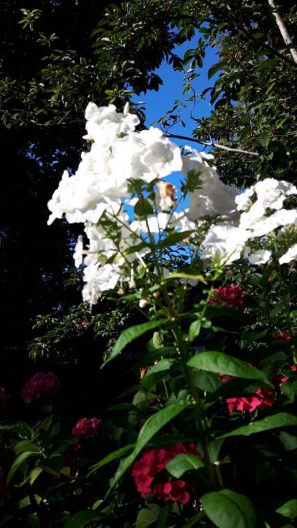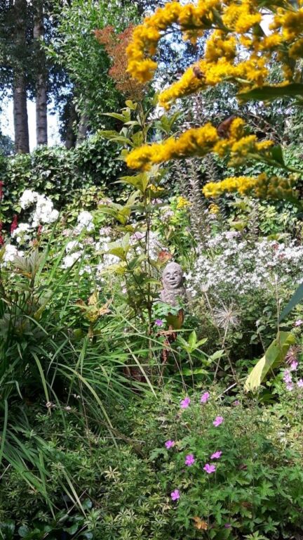 Ontelbare bijen zoemend rond en op de gouden guldenroeden, witte en gele vlindertjes die van de floxen via de roze spirea naar de enorme kattenstaart dartelen, frambozen die langzaam roze worden, knalrode aartjes, roze en spierwitte floxen, blauwe ooievaarsbekken, een roze stokroos, witte astertjes, buddleia’s in allerlei tinten met heel veel vlinders, een voorzichtig kleurende hemelsleutel en nieuwe witkanten vlierbloemen die reiken naar de blauwe lucht.