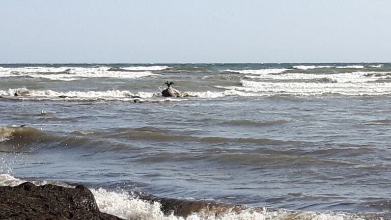 Wat is de kracht van de zee toch imponerend. Zelfs de meeuwen waagden het niet om te vliegen en dobberden vlakbij het strand. In de verte zat een aalscholver op een rots zijn vleugels te drogen. Hij woei zo nu en dan gewoon van de rots af!
