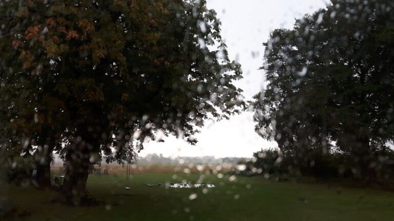 Maar vanmorgen barstte het onweer dan toch los, vergezeld van een tropische stortbui die maar een kwartier duurde en alles onder water zette! De eigenaar van Tiendegaarden moest zelfs met planken een begaanbaar pad naar haar monumentale trap bij de voordeur maken.