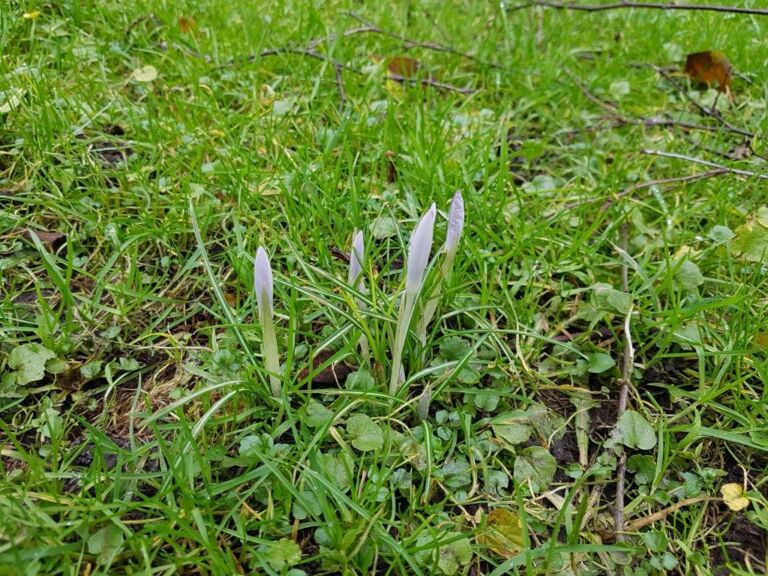 het eerste krokusje komt op in het gras.