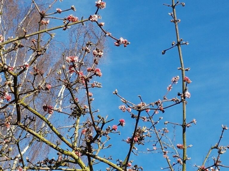 de roze winterbloeier steekt af tegen het blauw,