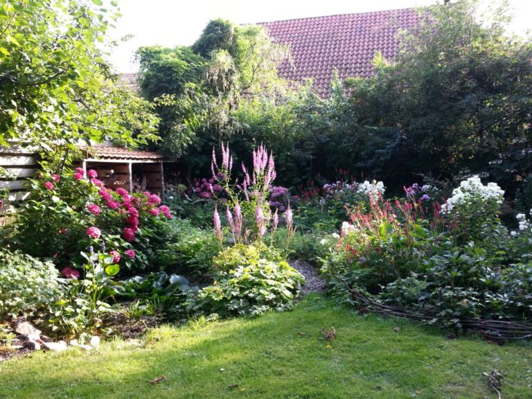 Met precies achter mijn tuin een hele grote oude boerenschuur met een immens hoog rood pannendak. Die mijn tuin tot een hele intieme en beschutte tuin maakte.