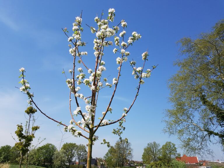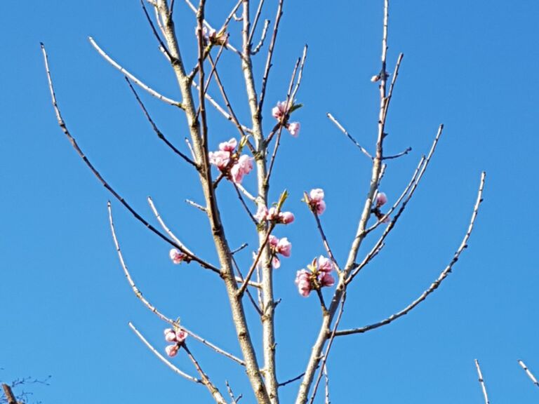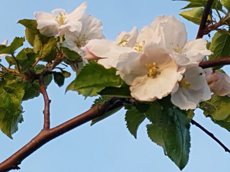 En ze hebben ook alle zes gebloeid! De amandel was de eerste, knalroze tegen strakblauwe lucht en daarna kwamen de kersen en de appels!