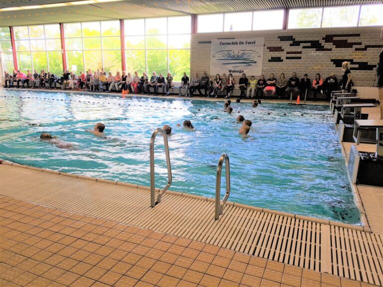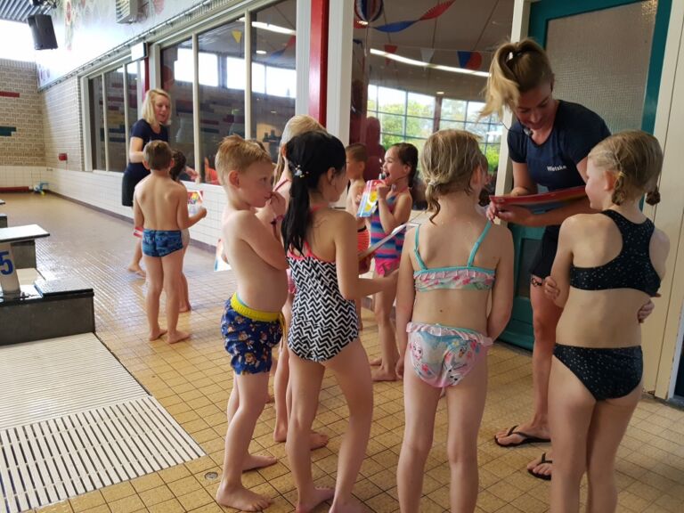 Het diploma zwemmen was spannend! Alle kinderen hadden wit weggetrokken smoeltjes maar toen de muziek door het bad schalde en ze allemaal hun eerste diploma kregen was iedereen trots en blij!