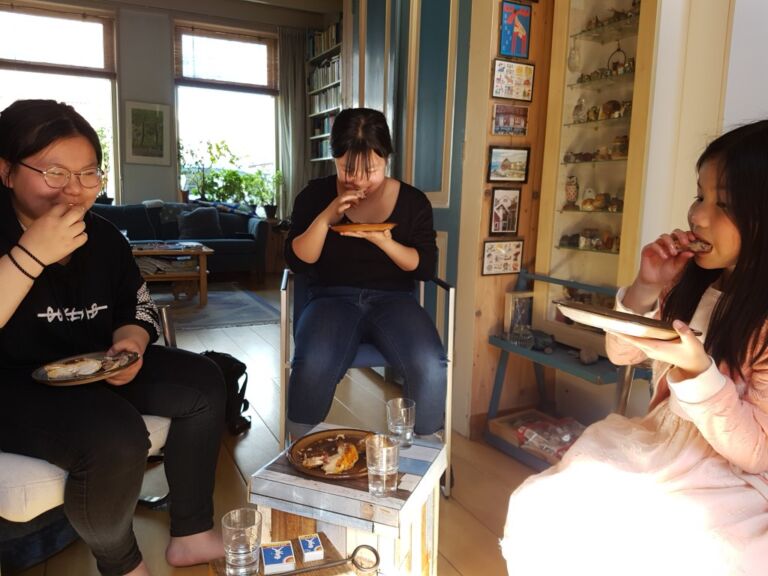 Ik zou voor taart zorgen had ik ze gezegd en wat was het verrassend dat zij met een hele kip aankwamen! Wéér zo’n cultuurverschil. Hij werd keurig in hapklare brokken verdeeld, ik kreeg het lekkerste stukje en binnen tien minuten was alles op!