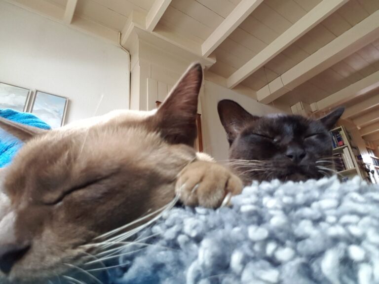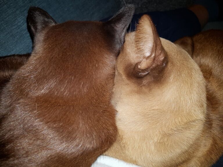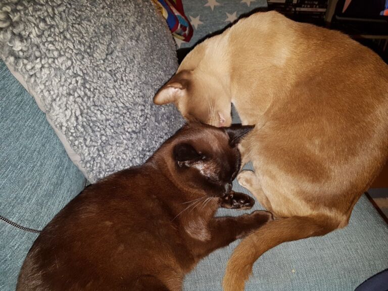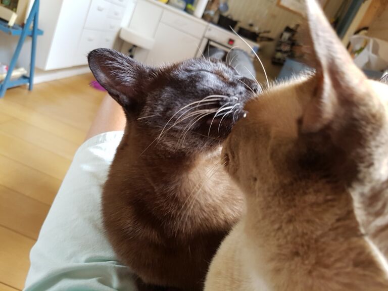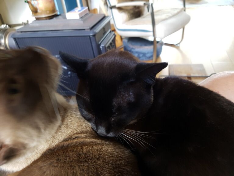 Ze liggen samen op schoot en ze zoekt hem zo nu en dan zelfs op om zich dan helemaal te laten schoon likken en spinnend in slaap te vallen. Geen spoor van boosheid meer!
