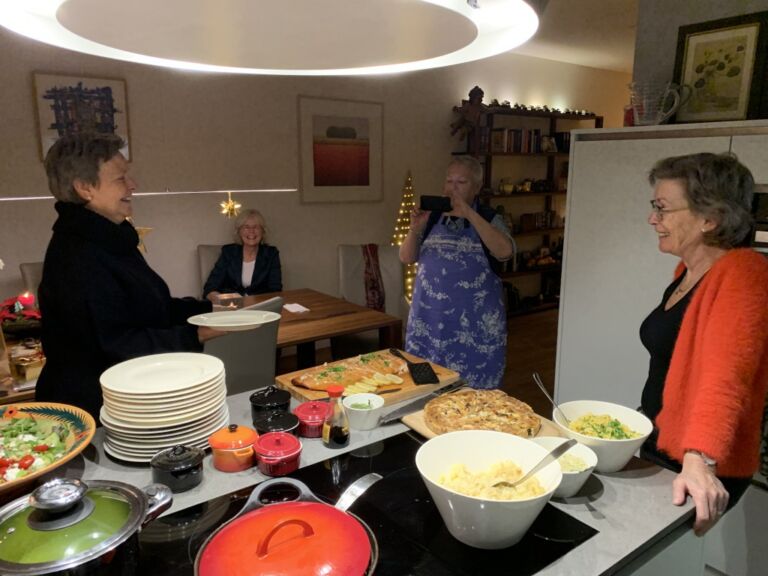 Er werd kennis gemaakt zo van ‘oooh, ben jij nou…!’ en we aten de heerlijkste gerechten. Behalve twee soorten soep waren er kleine pannetjes stoofvlees, een ter plekke gerookte zalm met dank aan M en tot slot fantastische toetjes. Alles even feestelijk en lekker.