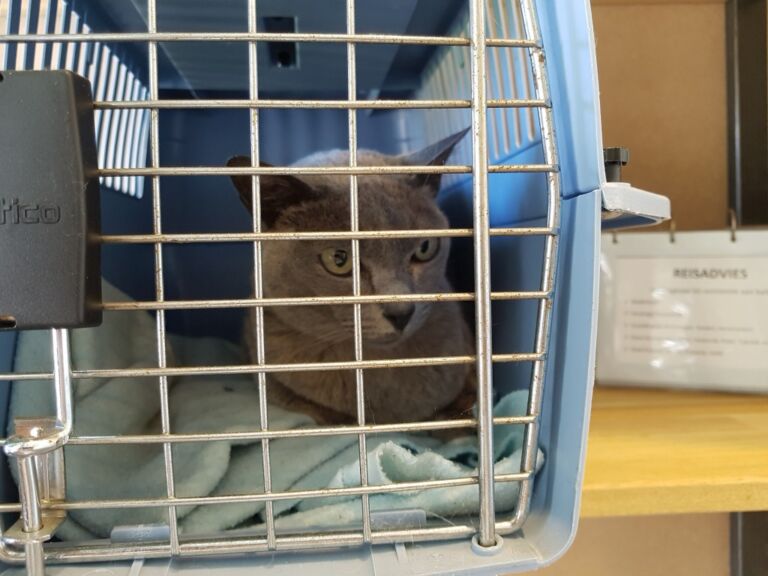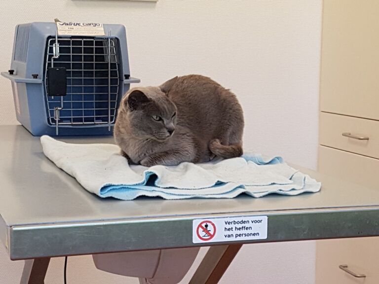 Wat helpt het toch dat het zo’n makkelijk katertje is, gewoon geduldig wachtend op de onderzoekstafel! Dus antibiotica en prednison, daarmee zou het weer over moeten gaan.
