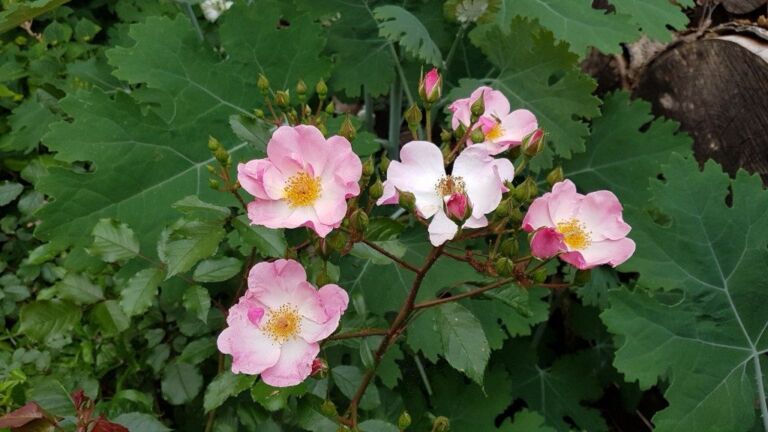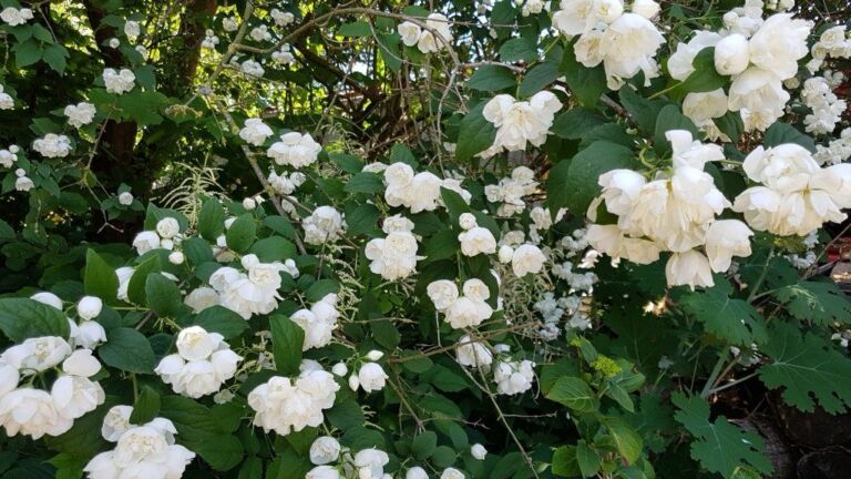Weelderig bloeiende planten, struiken die hun weg naar het licht zochten en als een gek waren gegroeid, vaste planten die hooguit 20 cm hoog waren toen ik vertrok en nu de meter benaderden, een uitgebloeide blauwe regen, stokrozen die boven het dak uitkwamen, een volop bloeiende jasmijn, een dichtgegroeide vijver en prachtig bloeiende rozen.