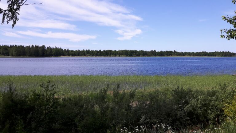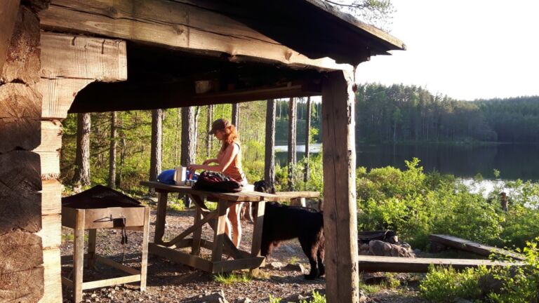 Een hoogtepunt uit mijn weekje Tolvsbo was het bezoek aan vriendin J, een vroegere medewerker van het hotel die in Asmansbo, een dorpje zo’n 25 km verderop woont. Net als vorig jaar nodigde ze me uit om te komen eten. Het was een prachtige dag en een prachtige avond dus J stelde voor om naar het meer te rijden waar de mensen van het dorp een soort overdekte picknickplek hebben. Er is een voorraad houtjes, een steigertje, een vuurplaats met bankjes en er wordt vis gevangen en gerookt.